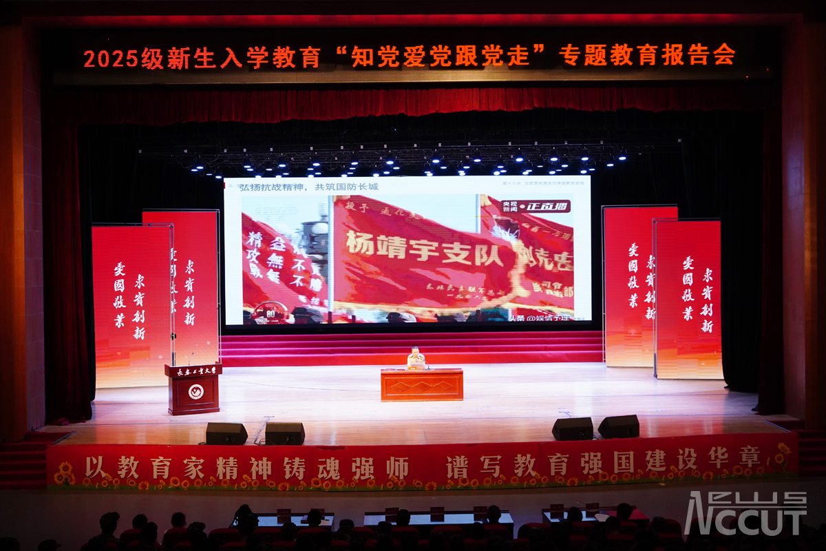 新闻网讯(通讯员 王颖群)9月15日18时,学校在大学生活动中心举行2025级新生入学教育“知党爱党跟党走”专题报告会。校关工委主任李廷吉、校关工委常务副主任谭君、党委学生工作部、团委有关人员及新生辅导员、全体2025级新生同学5400余人参与活动。学校特聘“老军人”吉林省军区教导大队原政委刘万军教授受邀作专题报告。报告会由团委书记、关心下一代工作办公室主任邵捷主持,活动在三校区线下线上同步开展。